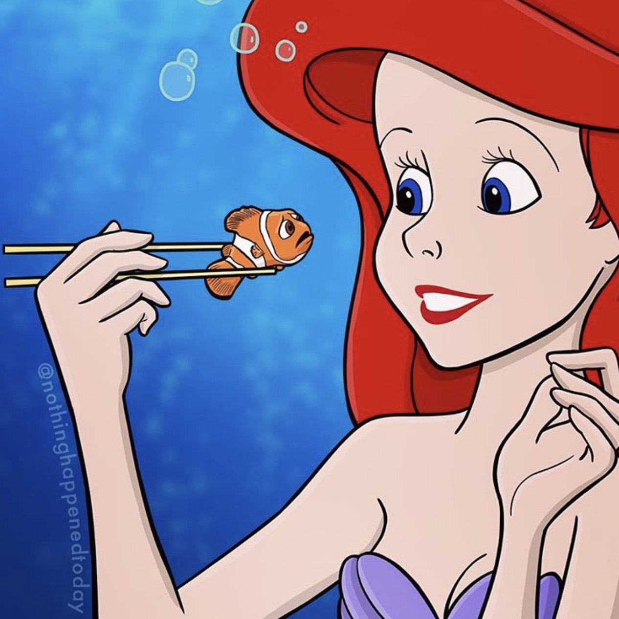 Didn’t plan on discovering what’s under a Smurf‘s hat, how Edward Scissorhands cleans up in the toilet, or The Little Mermaid’s Ariel preparing to eat Nemo, from Finding Nemo?