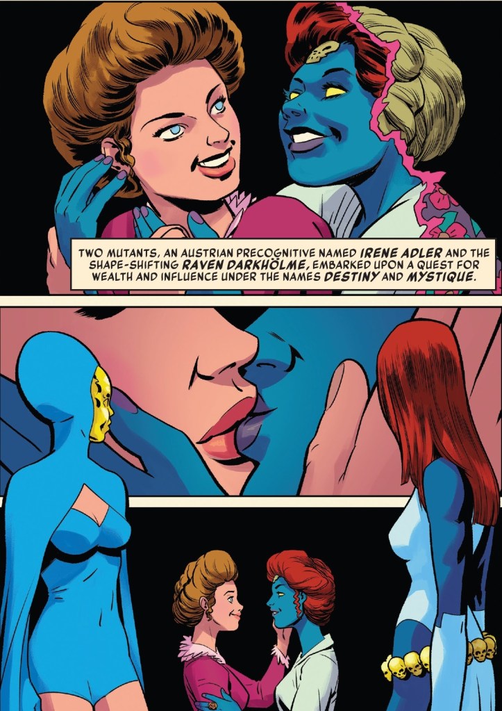 An established character in the X-Men universe, Mystique has been depicted in both comic books and live action movies with the mutant power of shapeshifting. Despite her ability to look anyone – male or female – her most common form is as a biological female. She has also been shown to have been in relationships with men (with Magneto in X-Men: First Class, for example), but her most meaningful relationship has been with Irene Adler, the blind mutant precognitive known as Destiny, which was first confirmed in Uncanny X-Men #265.