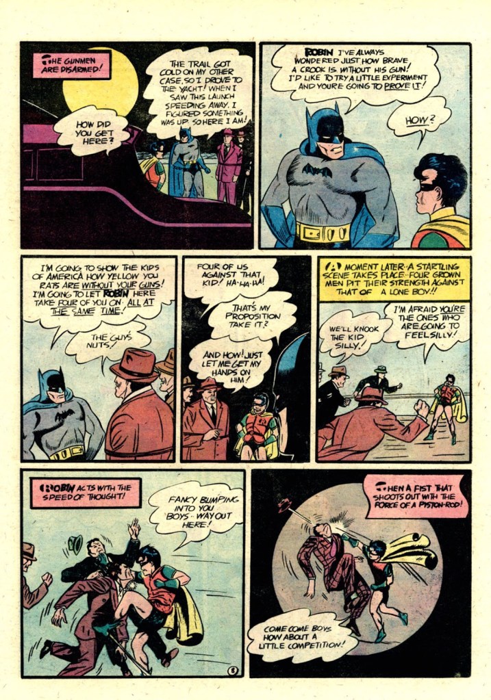 Incidentally, there’s also this weird sequence in the story when Batman decides to moralize about guns by releasing four tied up goons to have a hand-to-hand fight with Robin.