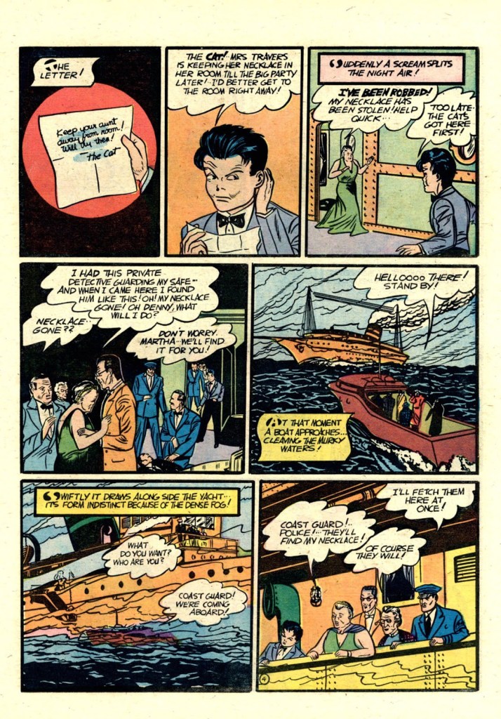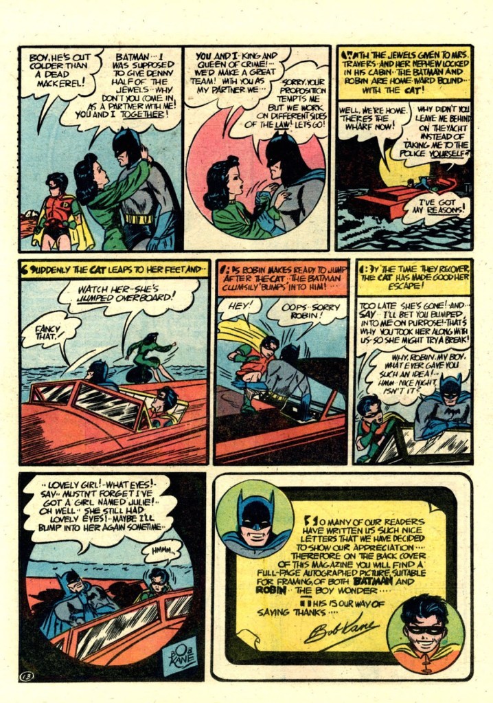 In this story, she was a mysterious burglar and jewel thief, who is revealed at the end of the story to be a young, attractive woman. She does not wear her familiar cat suit but this story establishes her as a femme fatale who both antagonizes and attracts Batman. At the end of the story, Batman is implied to have deliberately let her get away by blocking Robin from catching her.