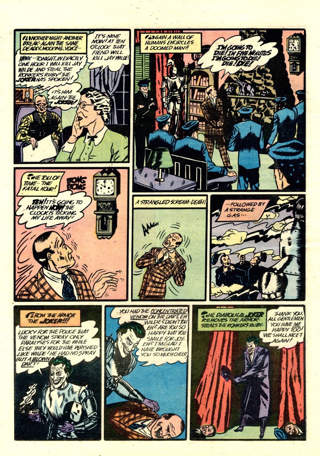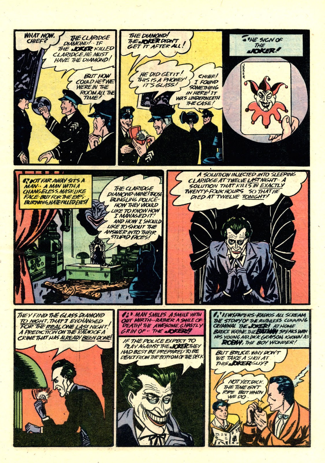 The Joker’s first appearance in April 1940’s Batman #1 actually set the foundations for the Joker as we know him today – 80 years later. Debuting one year after Batman’s debut in Detective Comics #27 in May 1939, the Joker was depicted as a remorseless serial killer, whose face was stuck in a grin that made him look like the joker playing card (which was also his calling card). He killed victims with a “Joker venom” which left their faces stuck in a grotesque smile. Sound familiar?