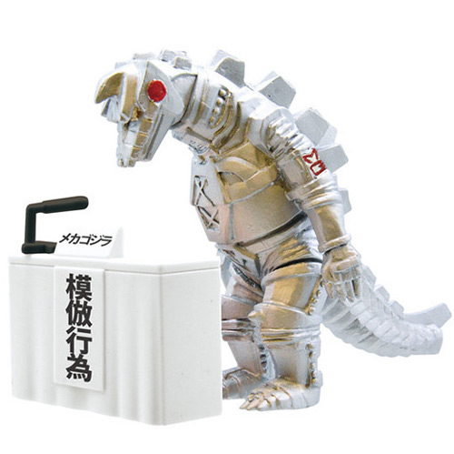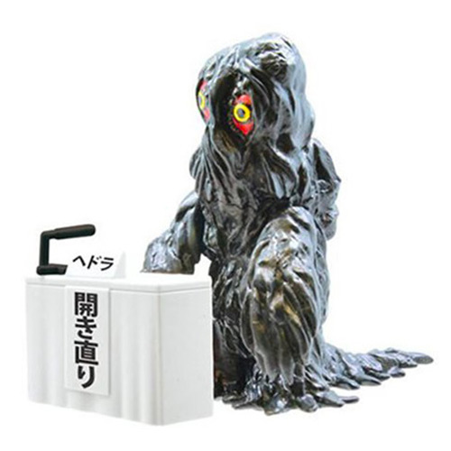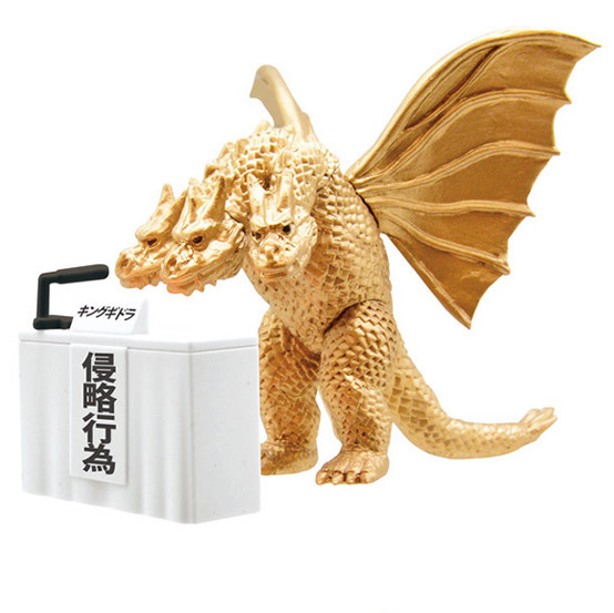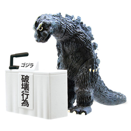 Sold in gachapon vending machines for ¥300 (~US$3, although good luck trying to find any at that price now!), Godzilla, Mechagodzilla, King Ghidorah and Hedorah (the Smog Monster) figurines bow in contrition from behind a typical press conference podium with signs explaining what they were apologizing for. These are typical scenes in Japan whenever a senior government official, celebrity, corporate leader has done something wrong, and must accept responsibility.